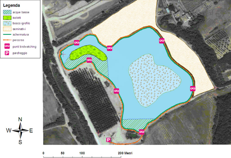 PROPOSTA DI CONVERSIONE D’USO DELLE VASCHE DI DECANTAZIONE PER LE ACQUE DI LAVAGGIO DELL’ATTIVITA’ ESTRATTIVA DELLA SOCIETA INERTISCAVI s.r.l. PRESSO L’AREA PODERE S. PAOLO - LOC. PIANELLA (SI) Con la presente siamo qui a presentare una proposta di massima per la conversione delle attuali vasche di decantazione, per le acque di lavaggio impiegate nell’attività estrattiva, realizzate ed utilizzate dalla società Inertiscavi s.r.l. presso l’area podere S. Paolo – loc. Pianella (SI), in una zona umida in grado di ospitare l’avifauna stanziale e migratoria. Questo al fine di incrementare la biodiversità specifica, funzionale ed ecosistemica dell’intera area. A) Status del sito Attualmente le vasche di decantazione delle acque di lavaggio degli inerti coprono una superficie di circa 5 ha; pur essendo di origine artificiale e mai state oggetto di interventi mirati alla naturalizzazione presentano vegetazione spontanea erbacea ed arbustiva palustre, costituita da tifa o lisca maggiore Typha latifolia, cannuccia palustre Phragmites australis e salice bianco Salix alba. All’interno delle vasche è probabile la nidificazione di folaga Fulica atra e germano reale Anas platyrhynchos data la presenza pressoché costante delle due specie durante il periodo riproduttivo. Il sito è inoltre utilizzato da Ardeidi, quali: airone cenerino Ardea cinerea, garzetta Egretta garzetta e nitticora Nycticorax nycticorax; quest’ultime due specie sono incluse nell’allegato I della “Direttiva 97/49/CE modifica della Direttiva 79/409/CEE del Consiglio concernente la conservazione degli uccelli selvatici”. Le specie menzionate nell’allegato I sono oggetto di misure speciali di conservazione concernenti i loro habitat, al fine di assicurare la loro sopravvivenza e la loro riproduzione nelle aree di distribuzione. L’area dista circa 2,3 km in linea d’area dai laghi compresi nel Sito di Interesse Regionale (SIR) e Comunitario (SIC) e Zona a Protezione Speciale (ZPS) IT5190004 “Crete di Camposodo e Crete di Leonina” all’interno dei quali ogni inverno stazionano regolarmente importanti contingenti di anatre di superficie, quali germano reale, mestolone, fischione e alzavola e anatre di profondità come moriglione, moretta e in maniera irregolare moretta tabaccata; anche quest’ultima è inclusa nell’allegato I della direttiva di cui sopra. Da questo emergono le potenzialità conservazionistiche della zona umida in oggetto, in particolare come possibile area di sosta e stazionamento durante il periodo della migrazione invernale. B) Proposte di interventi di miglioramento ambientale e valorizzazione della zona umida (Tav. 1) Intervento 1 – Rimodellamento del terreno per la creazione di un’unica zona umida Intervento 2 – Creazione di aree a diversa profondità delle acque per l’avifauna Intervento 3 – Diminuzione della pendenza delle sponde per lo sviluppo della vegetazione riparia Intervento 4 – Realizzazione di una schermatura a Phragmites australis lungo il perimetro dell’area Intervento 5 – Realizzazione di un percorso naturalistico e punti per birdwatching C) Interventi ordinari di gestione per il mantenimento della corretta funzionalità ecologica della zona umida Tutti gli interventi di seguito elencati dovranno essere svolti al di fuori dei periodi riproduttivi (primavera) e di svernamento (autunno-inverno) dell’avifauna. I. Taglio periodico di tifa e cannuccia palustre della porzione interna al lago al fine di evitare la copertura e l’interramento della zona umida realizzate dal canneto; II. Tagli periodici del versante interno al lago del canneto costituente la schermatura, per ridurre la progressiva occupazione della zona umida; III. Essiccamento e lavorazione a cadenza tri - quadriennale del fondo del lago seguite da semina con graminacee foraggere per migliorare la produttività del sito; IV. Tagli periodici di diradamento degli esemplari di salice presenti nell’area centrale al fine di favorire la formazione di un bosco igrofilo semisommerso idoneo alla sosta e potenziale nidificazione degli Ardeidi presenti.